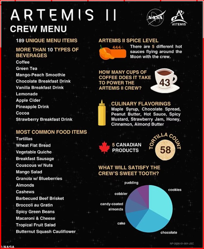 Përveç Nutella-s, kapsula Orion ka edhe tetë kondimente të tjera: shurup panje, gjalpë kikiriku, salcë e nxehtë, mustardë e fortë, reçel luleshtrydhe, mjaltë, kanellë dhe gjalpë bajame. Astronautët kanë mbi 10 lloje pije, përfshirë smoothies mango-pjeshkë, limonadë, cidër molle, çokollatë të ngrohtë dhe kafe të mjaftueshme për 43 filxhana.