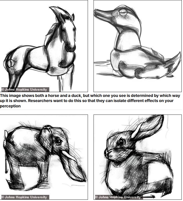 Secila figurë përmban dy kafshë të ndryshme – por, sipas shkencëtarëve, nuk është në dorën tuaj të zgjidhni se cilën do të shihni e para. Ashtu si një anagram krijon një fjalë tjetër kur shkronjat riorganizohen, këto figura shfaqin një imazh krejt tjetër kur rrotullohen.