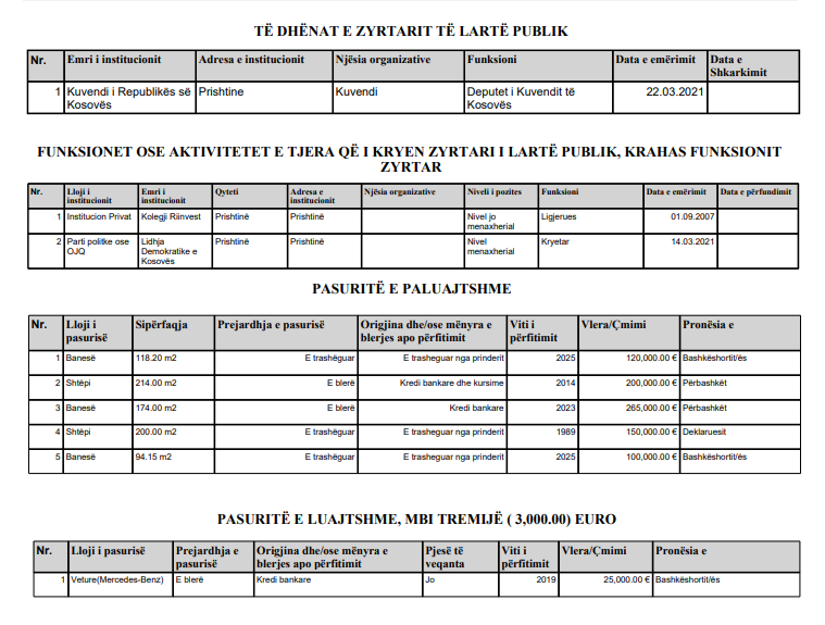 Sa i përket pasurisë së luajtshme, ai ka deklaruar një veturë Mercedes-Benz të vitit 2019, me vlerë rreth 25 mijë euro, në pronësi të bashkëshortes.