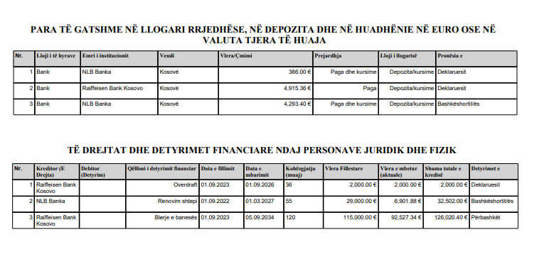 Sa u përket detyrimeve, ai ka deklaruar kredi për renovim shtëpie me mbetje prej 32,502 euro dhe kredi për blerje banese me detyrim të mbetur 126,020.40 euro.