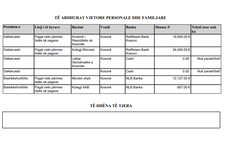 Në llogaritë bankare, Abdixhiku ka raportuar 386 euro kursime, si dhe 4,915.36 euro të ardhura nga paga, ndërsa bashkëshortja ka deklaruar 4,293.40 euro nga paga dhe kursimet.