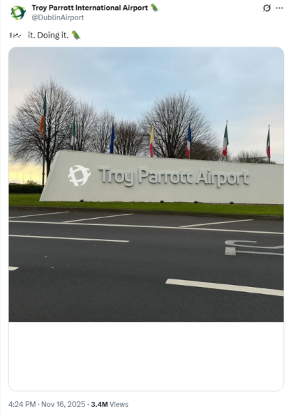 Llogaria publikoi një foto të aeroportit me emrin e “ndryshuar” në “Troy Parrott International Airport”.
