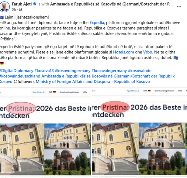 “Lajm i jashtëzakonshëm! Falë angazhimit tonë diplomatik, tani e tutje edhe Expedia, platforma gjigante globale e udhëtimeve online, ka korrigjuar pasaktësitë në faqen e saj. Republika e Kosovës tashmë paraqitet si shtet i pavarur dhe kryeqyteti ynë, Prishtina, është shënuar saktë, duke zëvendësuar emërtimin e gabuar “Priština”. Expedia është padyshim një nga faqet më të njohura të udhëtimit në botë, e cila ofron paketa të ndryshme udhëtimi. Pjesë e saj janë edhe platformat globale si Hotels.com dhe Vrbo. Në të gjitha këto platforma”, ka shkruar Ajeti. /Gazeta Express