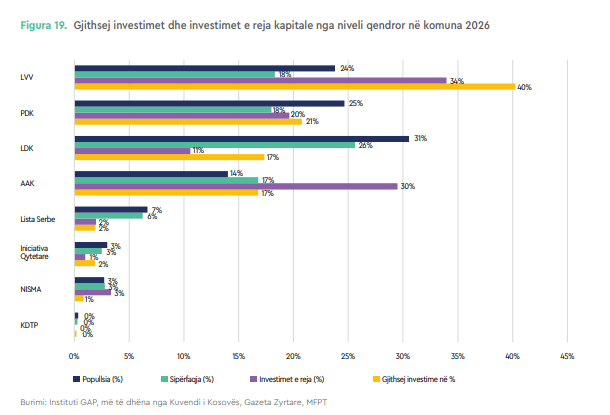 Shpërndarja e investimeve nga niveli qendror në komuna nuk është plotësisht proporcionale me popullsinë dhe sipërfaqen, duke nxjerrë në pah pabarazi në alokimin e investimeve. Lëvizja Vetëvendosje (LVV) përfiton pjesën më të madhe të investimeve, me 40.3% të investimeve totale dhe 34% të investimeve të reja, ndonëse përfaqëson 23.8% të popullsisë dhe 18.3% të sipërfaqes. Një situatë e ngjashme, sidomos sa i përket investimeve të reja, vërehet edhe te Aleanca për Ardhmërinë e Kosovës (AAK), e cila me 14.0% të popullsisë dhe 16.8% të sipërfaqes përfiton 29.5% të investimeve të reja. Në anën tjetër, Lidhja Demokratike e Kosovës (LDK), megjithëse ka përqindjen më të lartë të popullsisë (30.5%) dhe një pjesë të konsiderueshme të sipërfaqes (25.6%), merr 17.3% të investimeve totale dhe 10.6% të investimeve të reja. Partia Demokratike e Kosovës (PDK) paraqet një shpërndarje më të balancuar, ku përqindjet e investimeve janë më afër përqindjeve të popullsisë dhe sipërfaqes që ajo mbulon. Lista Serbe, përfaqëson 6.7% të popullsisë dhe 6.2% të sipërfaqes, përfiton rreth 2% të investimeve. Ndërkohë, subjektet më të vogla si KDTP, NISMA dhe Iniciativa Qytetare kanë një ndikim të kufizuar si në popullsi dhe sipërfaqe, ashtu edhe në investime