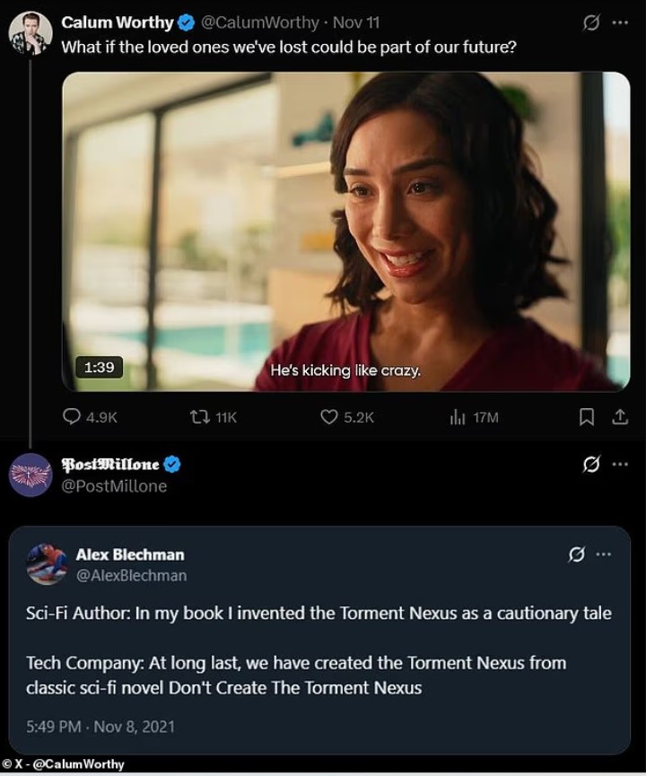 Në një postim në X (ish-Twitter), Worthy, 34 vjeç, shpërndau një reklamë tronditëse për aplikacionin duke shkruar: “E nëse të dashurit që kemi humbur mund të jenë pjesë e së ardhmes sonë?”