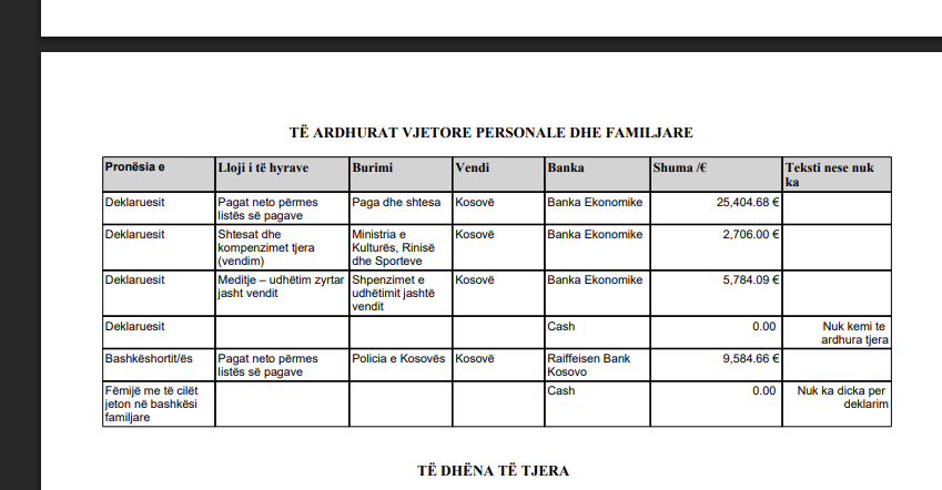 Gjithashtu, shefi i Policisë ka raportuar se mban 11 mijë e 522 euro para të gatshme në banka, prejardhja e të cilave është nga kursimet.