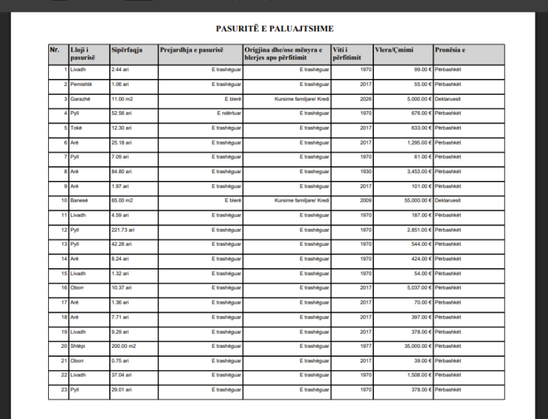 23 toka, livadhe, pemishte, ara, oborre, pyje, shtëpi e banesa, Gazmend Hoxha i ka deklaruar se kanë shumën e 113 mijë e 240 eurove.