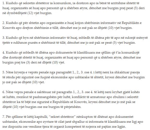 Ndërsa kushdo që sekretin shtetëror ia komunikon, ia dorëzon apo ia bënë të arritshme shtetit të huaj, organizatës së huaj apo personit që u shërben atyre, “dënohet me burgim prej pesë (5) deri në dymbëdhjetë (12) vjet burgim.”