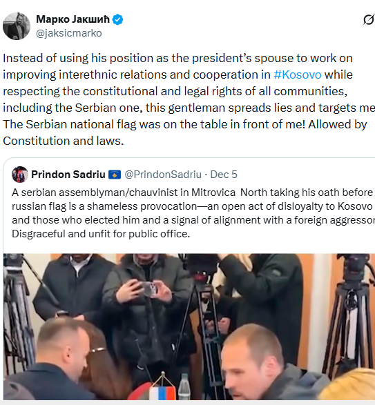 Asamblisti serb në Komunën e Mitrovicës së Veriut, Marko Jakshiq, i ka reaguar burrit të presidentes Osmani, Prindon Sadriut, pasi ky i fundit e ka quajtur si shovnisit Jakshiqin pasi ky i fundit kishte vendosur një flamur gjatë seancës inauguruese.
