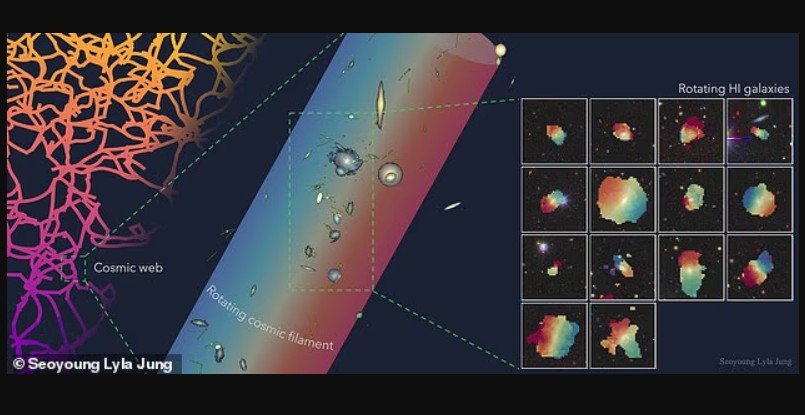 Fakti që galaksitë në filament rrotullohen në të njëjtin drejtim tregon se strukturat kozmike mund të ndikojnë fuqishëm në rrotullimin e galaksive.