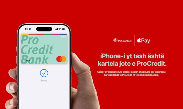 Prishtinë, Gusht 2025 – ProCredit Bank Kosova, në 25-vjetorin e veprimtarisë së saj në tregun bankar në Kosovë, prezanton Apple Pay për klientët e saj – një mënyrë më të sigurt, më të mbrojtur dhe më private për të paguar me iPhone dhe Apple Watch. Ky shërbim i ri u mundëson klientëve të shmangin dhënien e kartelës së pagesës personave të tjerë, prekjen e butonave fizikë apo shkëmbimin e parasë në dorë, duke përdorur fuqinë e iPhone për të mbrojtur çdo transaksion.