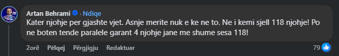 “Katër njohje për gjashtë vjet. Asnjë meritë nuk e ke në to. Ne i kemi sjellë 118 njohje. Po në botën tënde paralele, garant katër njohje janë më shumë se 118”, ka shkruar Behrami në llogarinë e Kurtit në Facebook.