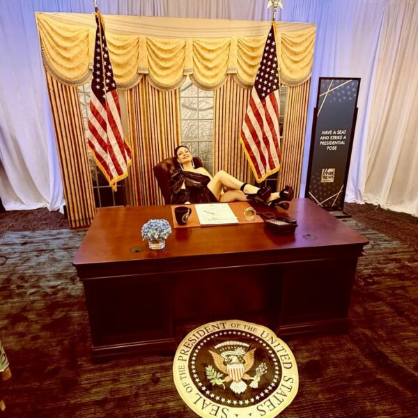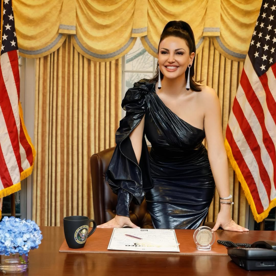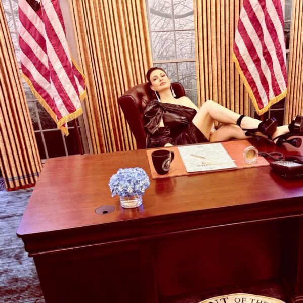 Me këtë mesazh, ajo sqaron se ambienti i fotosesionit është një imitim artistik i Oval Office dhe jo ambienti real në White House, duke ndërthurur ironi dhe kreativitet.