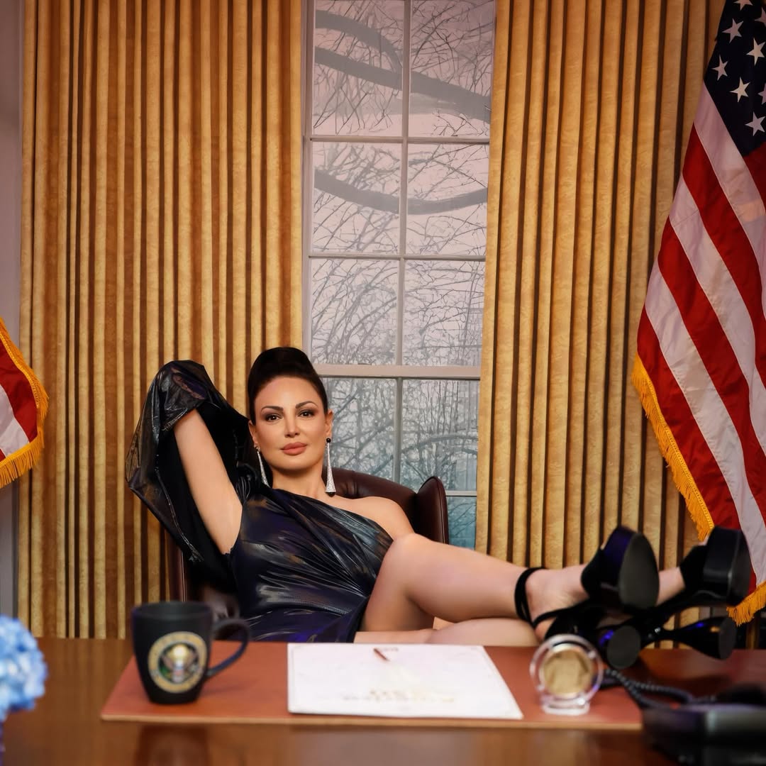 Pozat variojnë nga qëndrimi pas një tavoline që ngjan me atë presidenciale, deri te momente më të relaksuara në kolltuk—detaje që theksojnë konceptin e fotosesionit: vetëbesim, stil dhe një dozë satire.