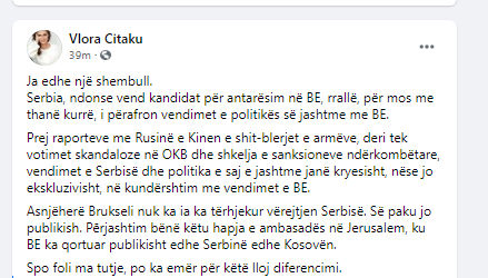 Ambasadorja e Kosovës në SHBA, Vlora Çitaku ka thënë përmes një shkrimi në Facebook se Serbia, ndonëse vend kandidat për anëtarësim në BE, rrallë, për mos me thanë kurrë, i përafron vendimet e politikës së jashtme me BE, raporton Gazeta Express.