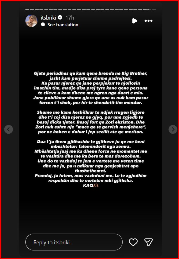 “Gjatë periudhës që kam qenë brenda në Big Brother, jashtë kam përjetuar shumë padrejtësi. Ka pasur njerëz që janë përpjekur të njollosin imazhin tim, madje disa prej tyre kanë qenë persona të cilëve u kam dhënë nga duart e mia,” – shkruan ajo.