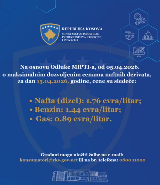 Ministria e Industrisë, Ndërmarrësisë dhe Tregtisë e Kosovës (MINT) ka bërë të ditur çmimet maksimale të lejuara për derivatet e naftës, të cilat do të jenë në fuqi për datën 15 prill 2026.
