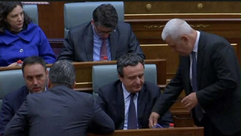 Një moment është kapur teksa ministri i Punëve të Brendshme, Xhelal Sveçla i tregon diçka nga telefoni i tij kryeministrit Albn Kurti.