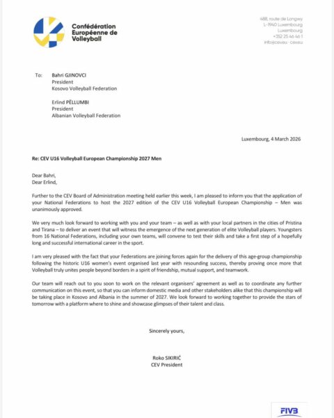 “Ky vendim i CEV-it vjen edhe si rezultat i organizimit shumë të suksesshëm nga Kosova dhe Shqipëria të Kampionatit Evropian U16 për vajza, i cili u mbajt gjatë verës së vitit 2026 dhe u vlerësua lartë nga institucionet evropiane të volejbollit”, njofton Federata e Volejbollit e Kosovës.