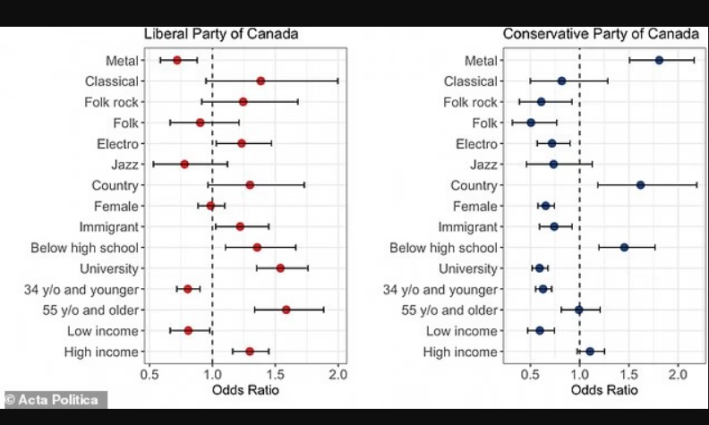 Shkencëtarët e Universitetit të Montrealit analizuan të dhënat e 125,000 personave mbi zhanret e tyre të preferuara muzikore dhe tendencat e votimit.
