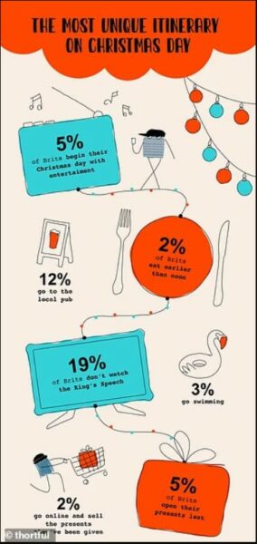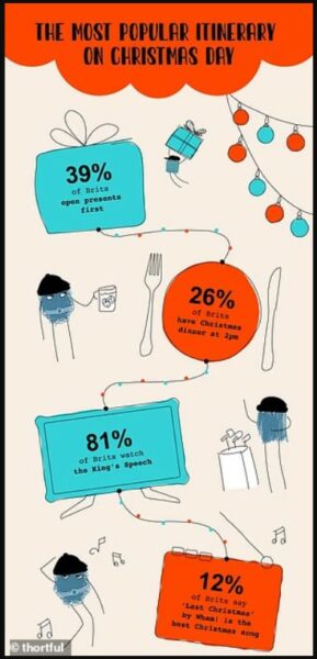 Një sondazh i fundit në Mbretërinë e Bashkuar tregoi se rendi i preferuar i aktiviteteve është: hapja e dhuratave, darka e Krishtlindjes, fjalimi i Mbretit dhe përfundimi me një lojë tavoline.