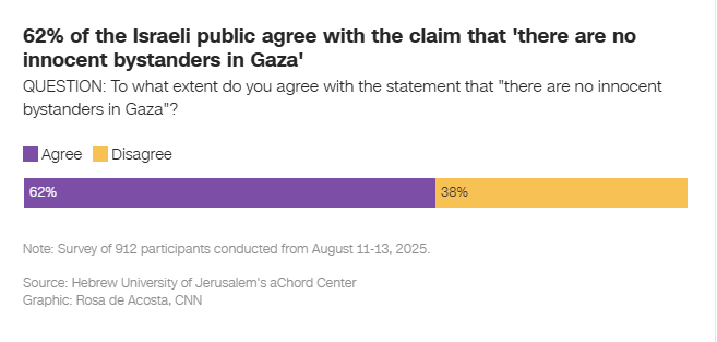 Një sondazh i zhvilluar në gusht nga Qendra aChord në Universitetin Hebraik të Jerusalemit tregon se shumica e popullit izraelit (62%) pajtohet me pohimin se “nuk ka të pafajshëm në Gaza”.