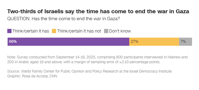 Sondazhet tregojnë se shumica e izraelitëve mbështesin në mënyrë të qëndrueshme një armëpushim. CNN ka mbuluar protestat javore të së shtunës në Tel Aviv, në të cilat mijëra njerëz u mblodhën për të shprehur zemërimin e tyre ndaj qeverisë dhe për të kërkuar përfundimin e luftës.