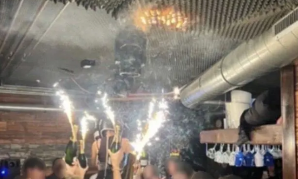 Tavani është ndezur – dëgjohet muzikë që luan në sfond dhe disa njerëz po filmojnë zjarrin në telefonat e tyre.
