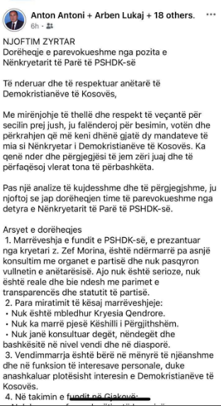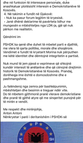 “PSHDK ka qenë dhe duhet të mbetet parti e djathtë, me vlera të qarta politike, morale dhe shoqërore. Vendimet e fundit të kryetarit Morina nuk përputhen me këtë identitet dhe dëmtojnë integritetin e partisë”, ka shkruar Antoni.