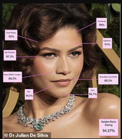 Dr. De Silva shpjegon: “Zendaya mori nota të larta për buzët (99.5%), sytë (97.3%) dhe ballin (98%), por humbi disa pikë për distancën mes hundës dhe buzës si dhe formën e vetullave.”