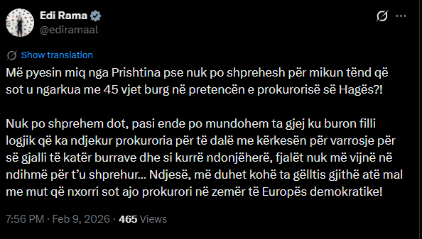 Kryeministri i Shqipërisë, Edi Rama, ka reaguar pasi Prokuroria e Gjykatës Speciale propozoi nga 45 vjet burg për krerët e UÇK-së, përfshirë Hashim Thaçin.