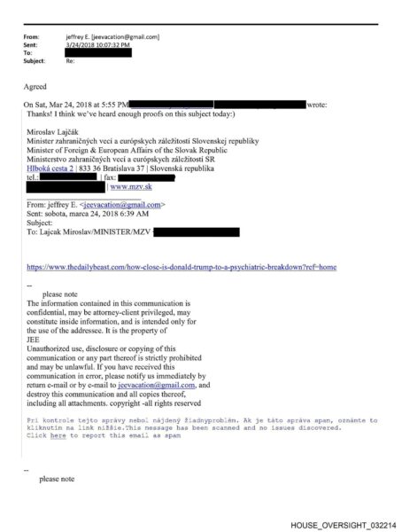 Jeffrey Epstein i dërgoi Lajçakut në mars të 2018-ës një link të një artikulli nga portali The Daily Beast për atë se sa afër një kolapsi psikik ishte Donald Trump. Diplomati sllovak thuhet se i ishte përgjigjur se atë ditë kishte dëgjuar mjaft për këtë temë. Epstein reagoi duke i thënë se pajtohej me të.