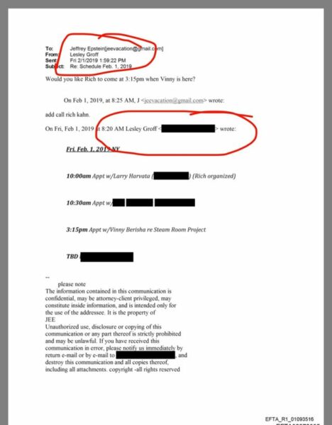 Në disa prej komunikimeve përfshihen edhe emra të tjerë të lidhur me rrethin e Epsteinit, ndërsa asistentja e tij, Lesley Groff, rezulton t’i ketë caktuar një takim, më 1 shkurt 2019 në rezidencën private në Manhattan.