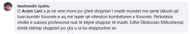 “O Arsim Lani, a je në vete more po çfarë shqiptari i madh mundet me qenë dikush që luan kundër Kosovës e aq më tepër që ofendon kombëtaren e Kosovës. Përkatësia etnike e suksesi profesional nuk të bëjnë shqiptar të madh. Edhe Sllobodan Millosheviqi është stërnip shqiptari, po çka u ka bë shqiptarëve se”, ishte komenti i tij.