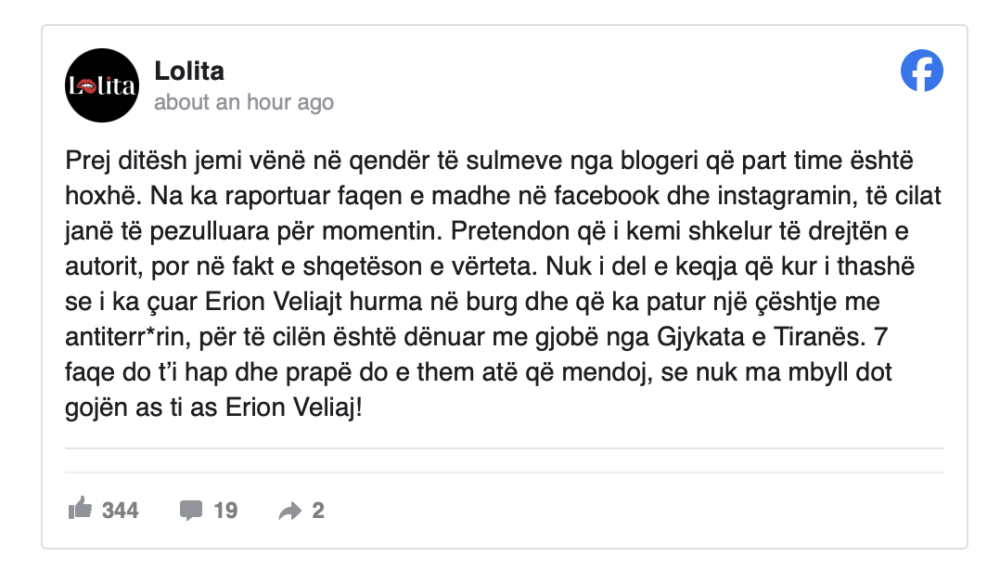 Faqja “Lolita” ka denoncuar një sulm ndaj llogarive të saj në rrjetet sociale. Faqja e famshe shqiptare në Facebook deklaron se pas pezullimit të faqeve kryesore qëndron hoxha Ahmed Kalaja. Në një reagim të publikuar online, administratorët e faqes thonë se janë vënë në shënjestër përmes raportimeve të qëllimshme ndaj përmbajtjes së tyre.