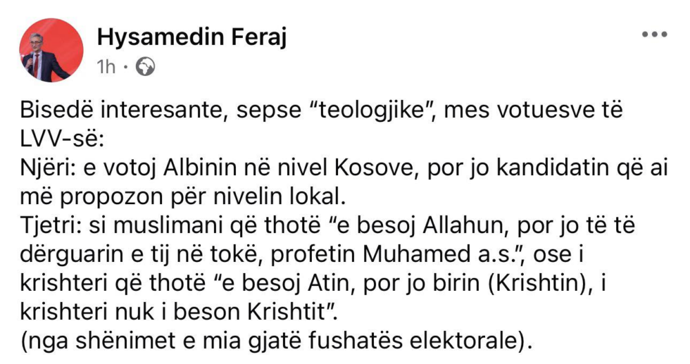 “Bisedë interesante, sepse “teologjike”, mes votuesve të LVV-së: Njëri: e votoj Albinin në nivel Kosove, por jo kandidatin që ai më propozon për nivelin lokal. Tjetri: si muslimani që thotë “e besoj Allahun, por jo të të dërguarin e tij në tokë, profetin Muhamed a.s.”, ose i krishteri që thotë “e besoj Atin, por jo birin (Krishtin), i krishteri nuk i beson Krishtit”. (nga shënimet e mia gjatë fushatës elektorale)”, ka shkruar Feraj.