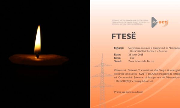 “Operatori i Sistemit, Transmisionit dhe Tregut të energjisë elektrike të Kosovës – KOSTT, ju fton të përcjellni ngjarjen- Ceremonia Solemne e Inaugurimit të Nënstacionit 110/35/10(20)kV Ferizaj 3-Kastriot”, thuhet në ftesën që KOSTT ua bën mediave dhe jo vetëm për ta përcjellur këtë ngjarje. Ceremonia do të mbahet në Zonën Industriale në orën 13:00.
