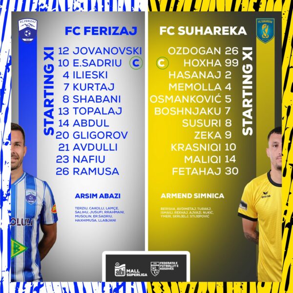 Janë publikuar formacionet zyrtare të ndeshjes së sotme mes Ferizajt dhe Suharekës, e vlefshme për Superligën e Kosovës në futboll.