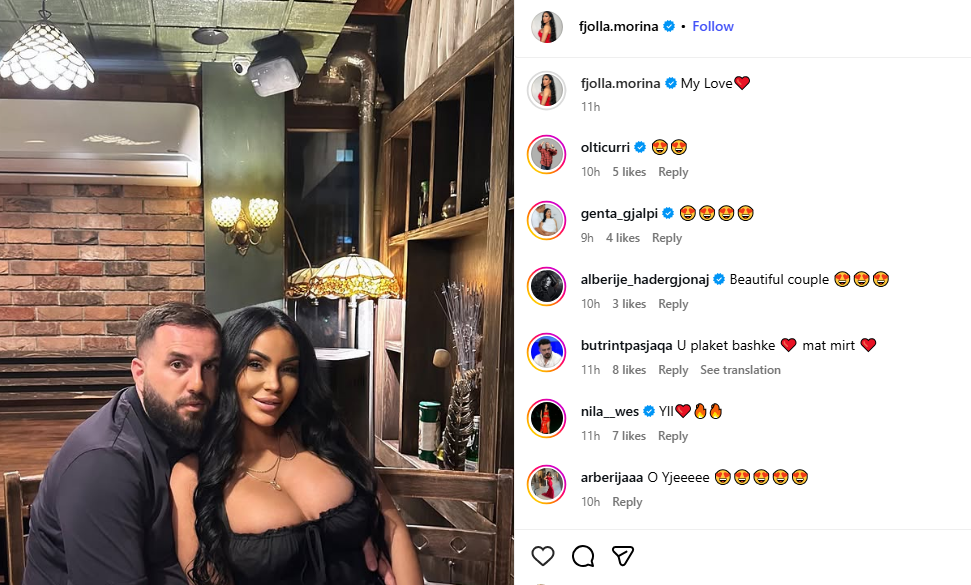 Ky është një tjetër moment i lumtur në jetën e Fjolla Morinës, e cila, edhe pse vazhdon të ruajë privatësinë e lidhjes, gjen mënyra të veçanta për të ndarë me fansat emocionet dhe çastet më të rëndësishme të saj. /GazetaExpress/