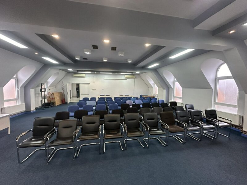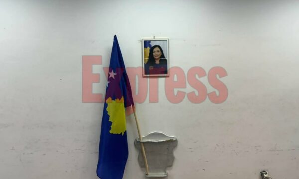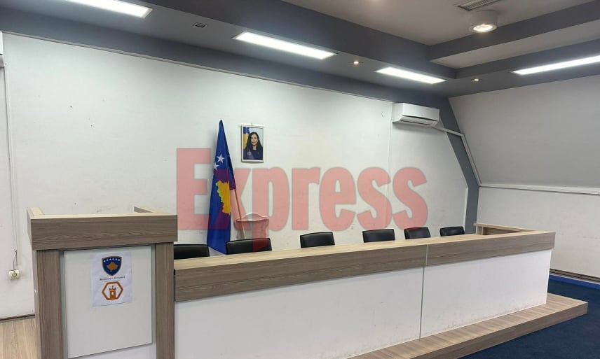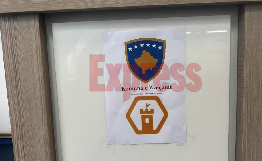 Në sallën e Kuvendit Komunal të Zveçanit ku do të betohet kryetari i ri Dragisha Milloviq janë simbolet e shtetit të Kosovës, përfshirë flamurin e Kosovës, fotografinë e Presidentes e stema prej letre.
