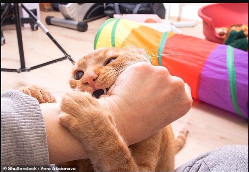 Negative – Macja duket sikur po kafshon gjatë lojës, por shenjat tregojnë stres.
