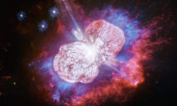 Ky është sistemi yjor “Eta Carinae”. Ndodhet rreth 7500 vjet drite larg planetit tonë. Ai përbëhet nga së paku dy yje, të cilët së bashku lirojnë pesë milionë herë më shumë energji se Dielli. Kjo pamje është siguruar nga teleskopi “Hubble Space”.