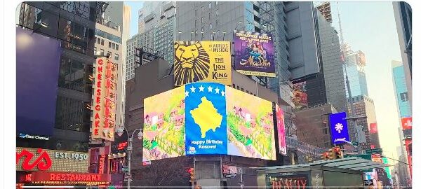 Në ekranin gjigant në Times Square të Nju Jorkut shfaqet flamuri i Kosovës me rastin e 18-vjetorit të pavarësisë