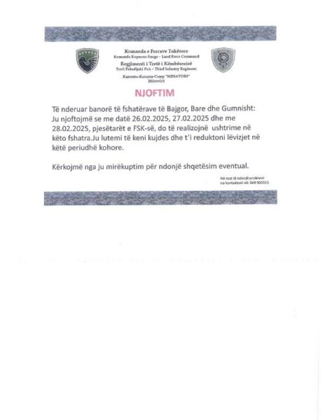 “Të nderuar banorë të fshatrave Bajgorë, Bare dhe Gumnishtë, ju njoftojmë se më datë 26.02.2025, 27.02.2025 dhe 28.02.2025 pjesëtarët e FSK-së, do të realizojnë ushtrime në këto fshatra. Ju lutemi të keni kujdes dhe t’i reduktoni lëvizjes në këtë periudhë kohore”, thuhet në njofitmin e komunës.