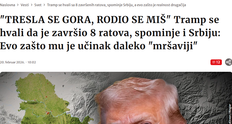““U dridh mali, polli një mi”. Trump mburret se i ka dhënë fund 8 luftërave, përmend edhe Serbinë: Ja pse performanca e tij është shumë “më e dobët””, është titulli i “Blic”-it serb.
