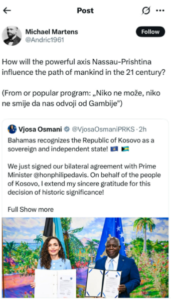 Martens, në një postim në rrjetin social ‘’X’’, me ironi, ka shtruar pyetjen se do të ndikojë ‘’boshti i fuqishëm’’, Prishtinë-Nassau në rrugëtimin e njerëzimit.