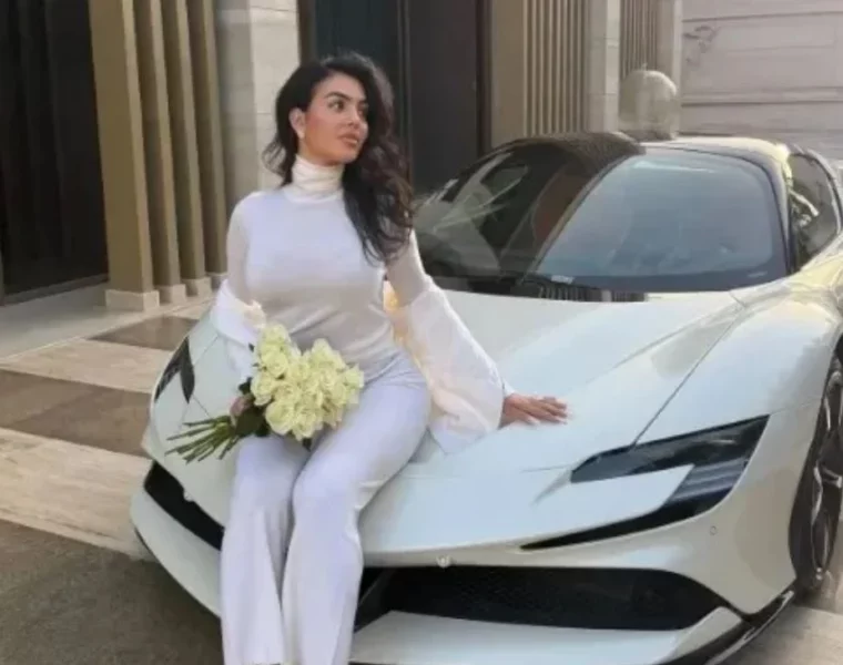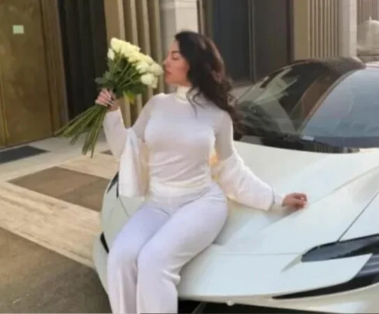 Në një nga fotot më të komentuar, ajo shihet e ulur mbi një supermakinë Ferrari, një model me vlerë rreth 440,000 funte (504.860 euro), duke mbajtur një buqetë me lule dhe duke dhënë një pasqyrë më personale të jetës së saj.