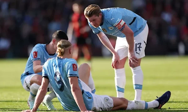 Haaland sapo kishte shënuar golin e tij të 30-të të sezonit gjatë fitores në FA Cup ndaj Bournemouth të dielën, kur ra pas një përplasjeje me Leëis Cook dhe kyçi i tij i majtë mbeti i bllokuar nën mesfushorin kundërshtar.