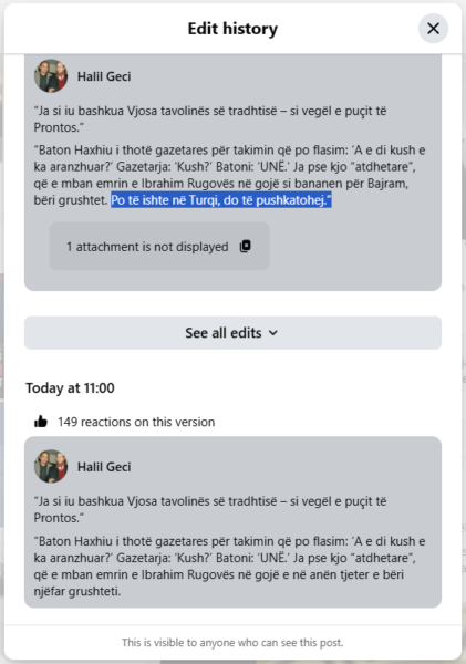 Pas këtij reagimi të Presidencës, Geci e ka korrigjuar pak postimin e tij në Facebook, duke ia hequr fjalinë me “pushkatim”.