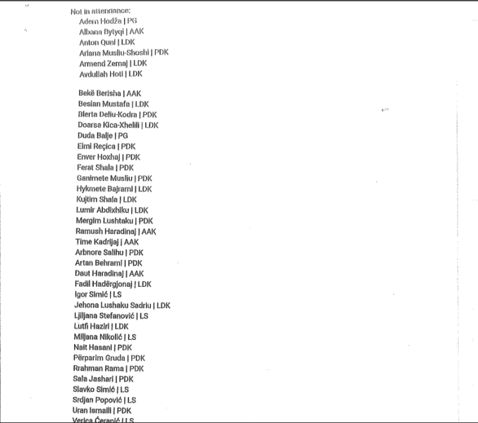 Për këtë, Haxhiu ia ka bashkuar shkresës edhe emrat e deputetëve që s’kanë marrë pjesë në seancë, e ku përfshihen edhe deputetët e Listës Serbe./Express/